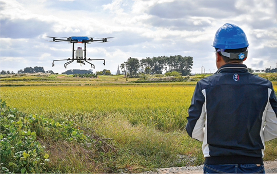 “위이잉.” 상공 3m. 수확철을 맞아 황금빛으로 익어 가는 벼 위로 초대형 농업용 드론이 굉음을 내며 날고 있다. 기기 무게 약 16kg에 12kg의 농약을 실은 드론은 두 개의 분사구를 통해 논 위로 농약(수확철이어서 시연에서는 물 사용)을 흩뿌렸다.