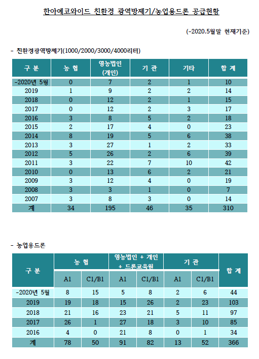 [공지] 한아에코와이드 친환경 광역방제기/농업용드론 공급현황