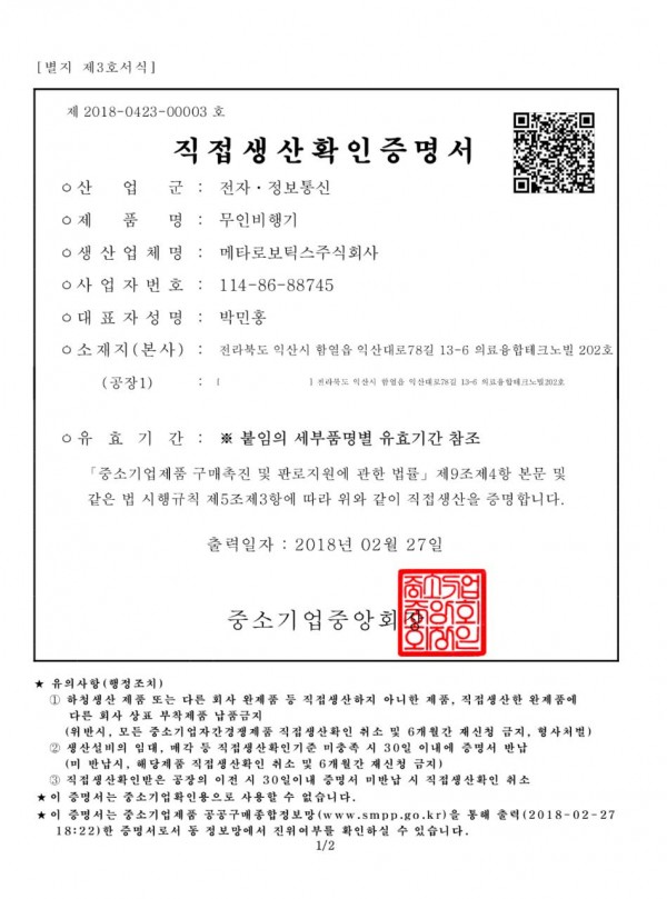 "중소벤처기업부 고시 2017-18 호에 따라 드론이 중소기업자간 경쟁제품으로 지정 시행"
